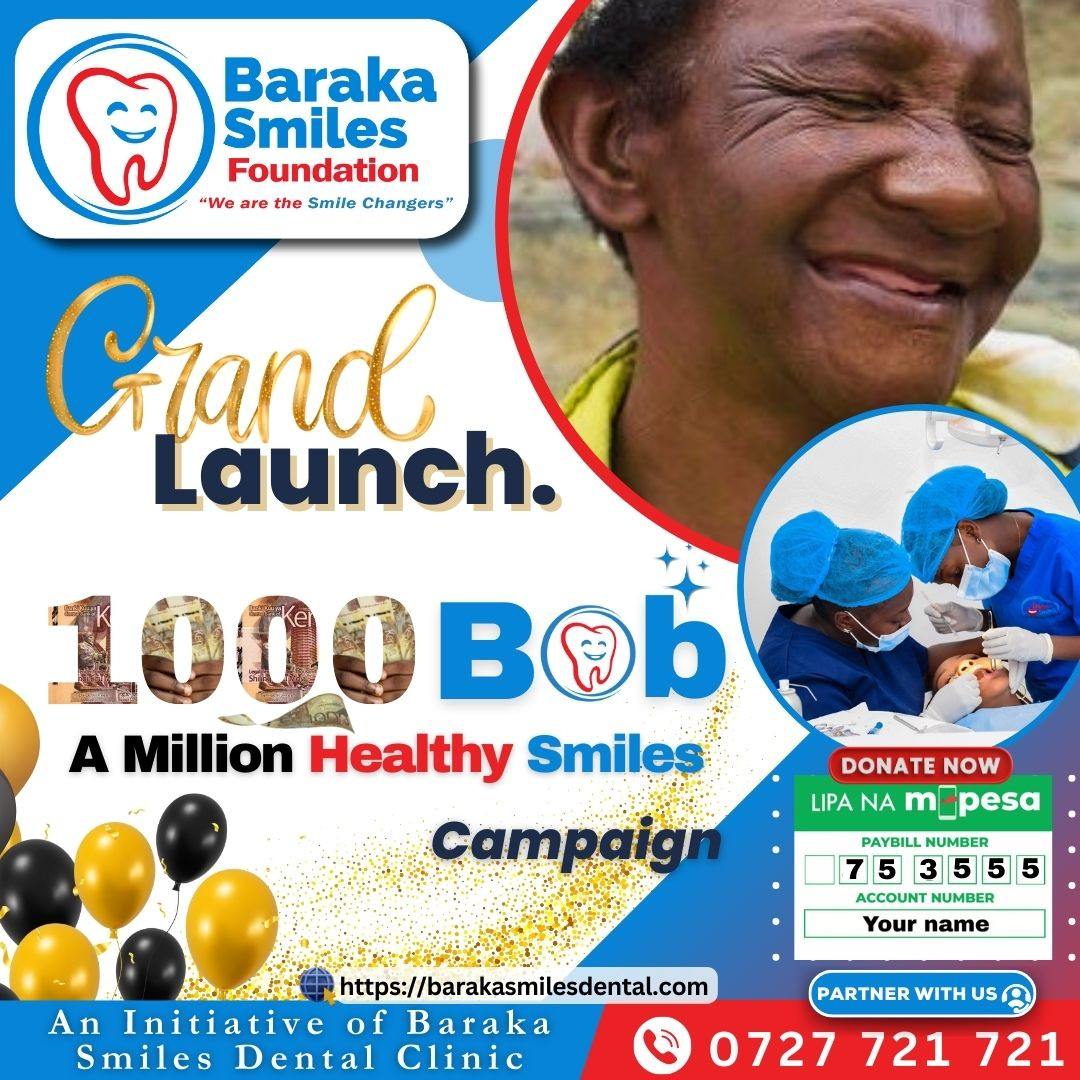 The 1 Million Healthy Smiles campaign by Baraka Smiles Foundation aims to provide free dental care to underserved communities. By donating just 1000 Bob or more, you can help fund dental treatments for children and the elderly who cannot afford proper care. Our goal is to raise enough funds to deliver essential services like cleanings, fillings, and checkups, improving the oral health and overall well-being of those in need. Join us in spreading healthier, brighter smiles across Nairobi and beyond, and together we can make a lasting difference, one smile at a time. You can channel your donations through the MPESA Pay-bill Number: 753555 Account: Your Name